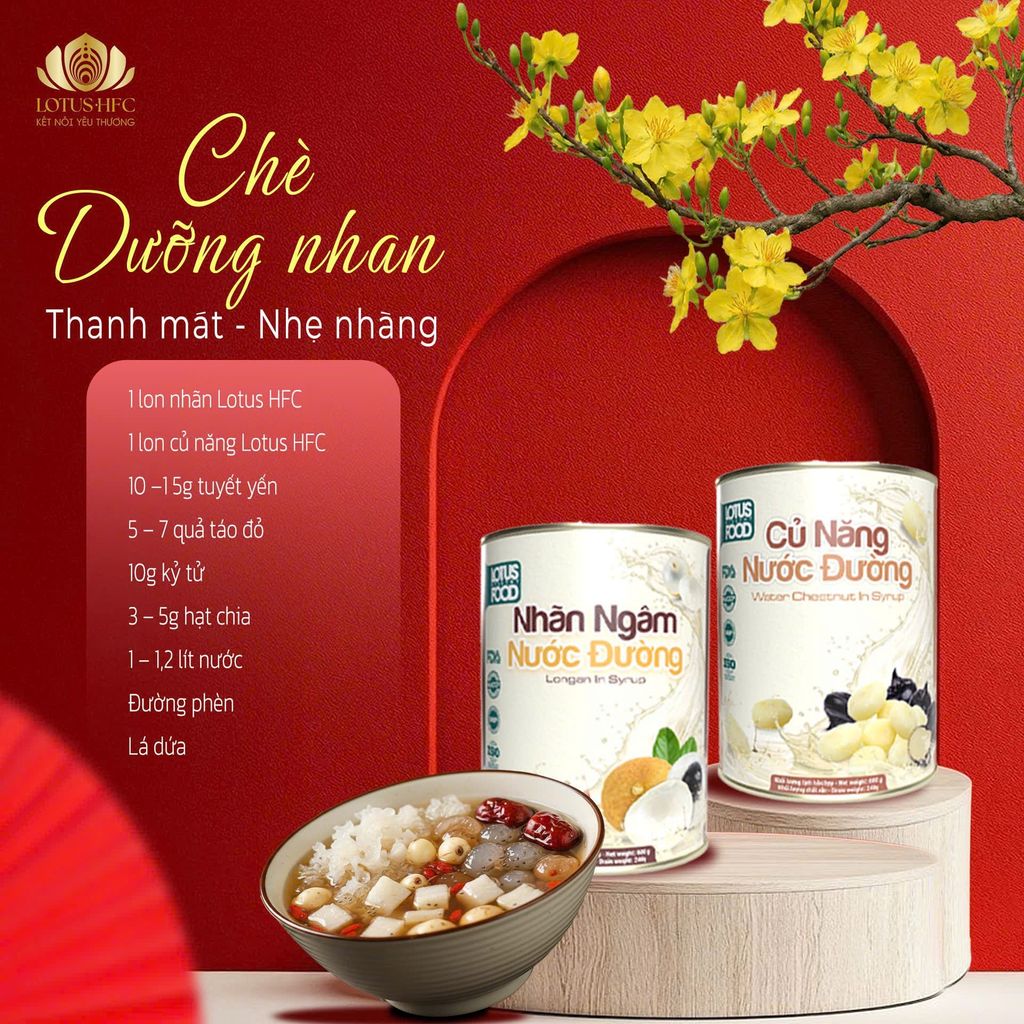 - Nhãn & củ năng Lotus HFC: vớt ra cho ráo, chắt bớt nước đường, giữ lại 1 phần nhỏ để tạo vị ngọt tự nhiên.