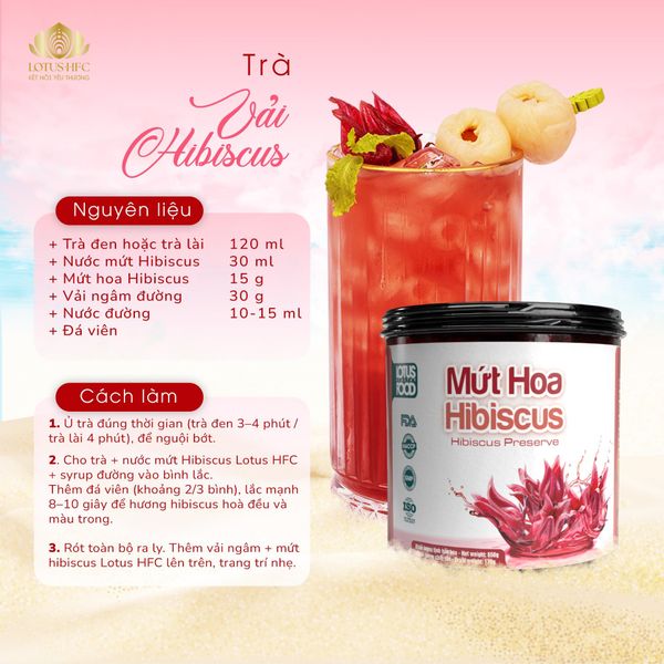 - Rót ra ly, thêm vải ngâm và mứt hibiscus Lotus HFC lên trên, trang trí nhẹ.